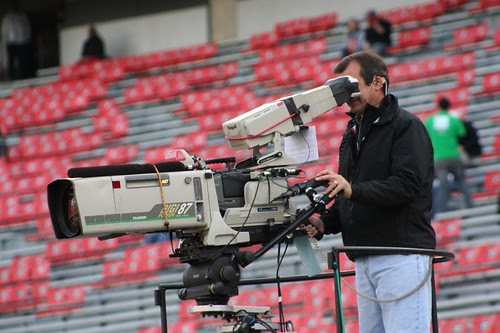 A CBS Sports cameraman getting ready for the November 2007 Auburn-Georgia football game in good weather.